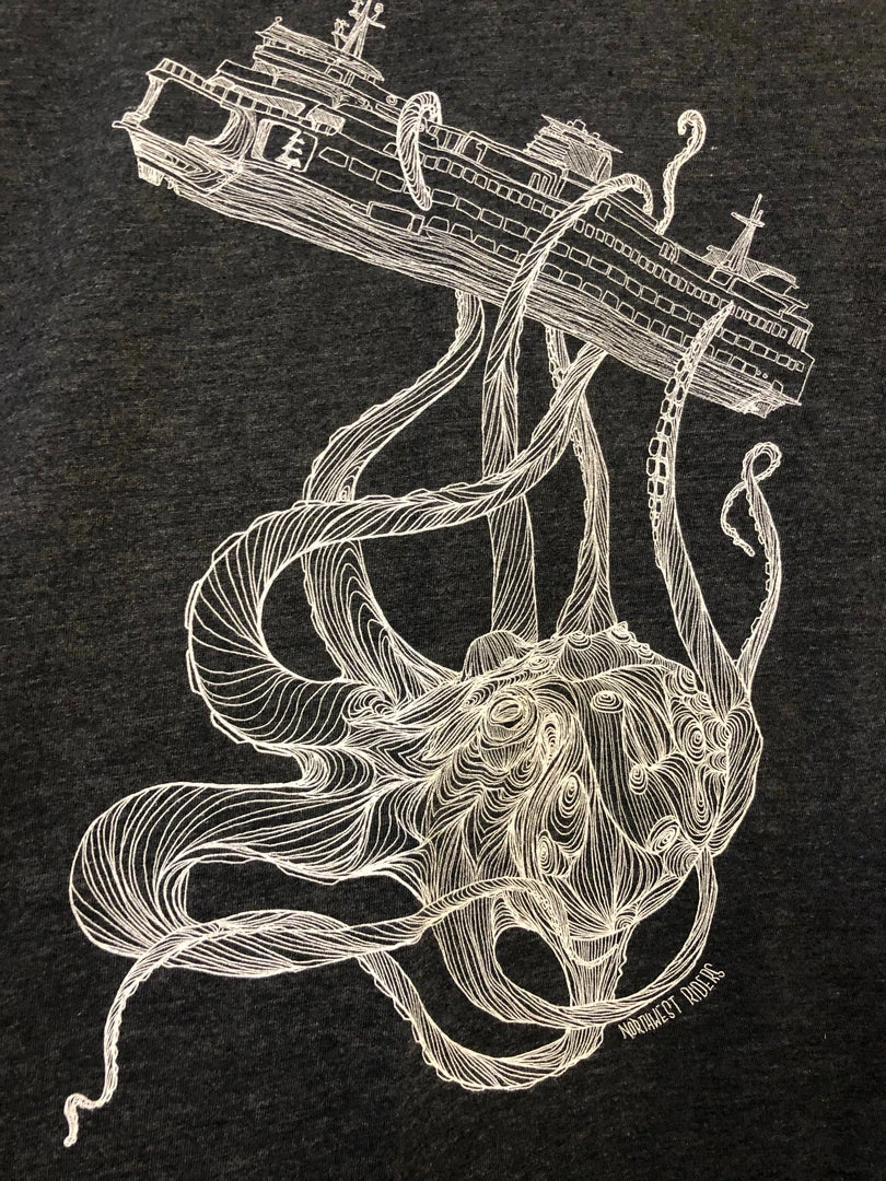 The ‘Kraken’ tee makes you consider what lurks in the depths of Puget Sound. This octopus means business and the Washington State Ferries are on the receiving end.